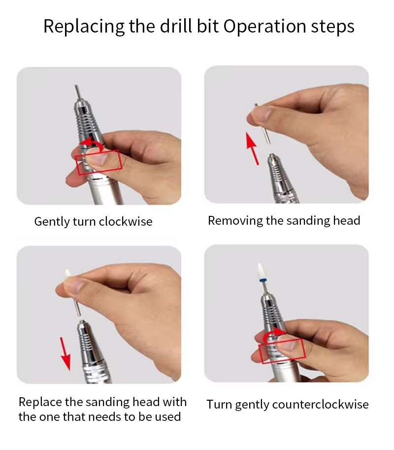 Itong 30,000 rpm electric nail drill replacement drill operation method, iyon ay, plug at pull out, madali at maginhawa, maaaring gamitin ang pagpapalit pagkatapos makumpleto.