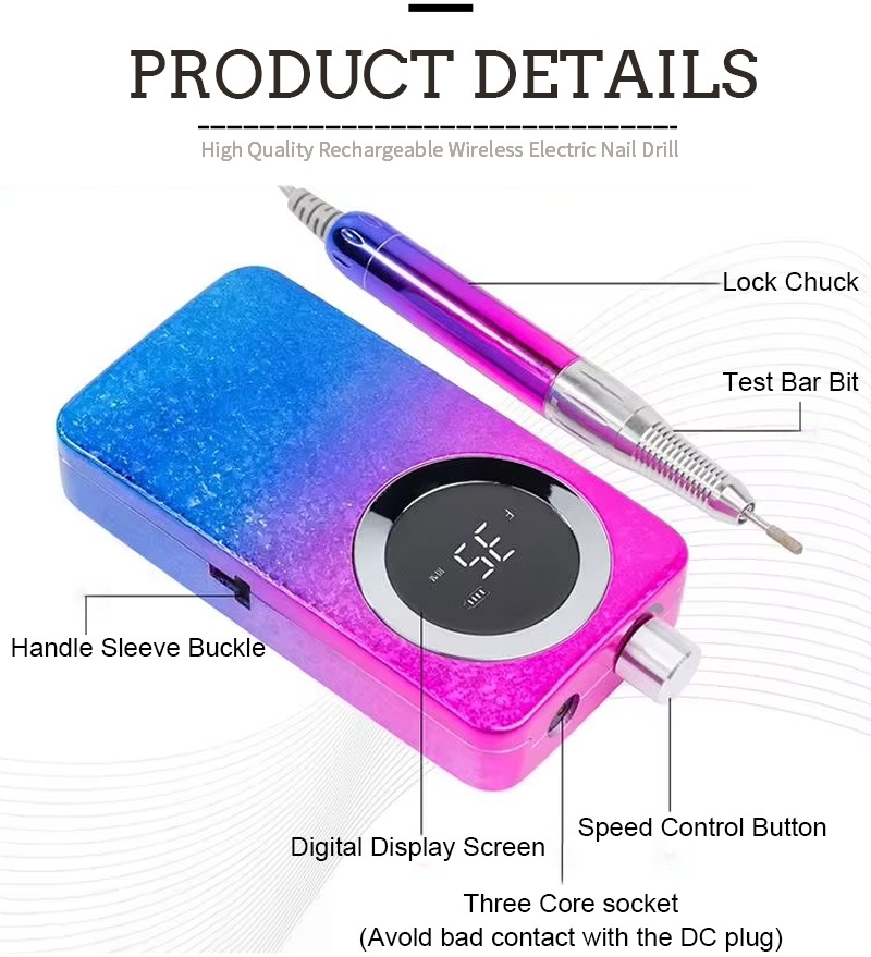 Ang disenyo ng display ng 30,000 rpm na electric nail drill na ito ay may on/off switch at forward/reverse rotation para sa kabuuang one-button activation, quick-charging socket sa ibaba, isang mapapalitang drill socket sa itaas, at three-position adjustable speed para matugunan ang iba't ibang pangangailangan.