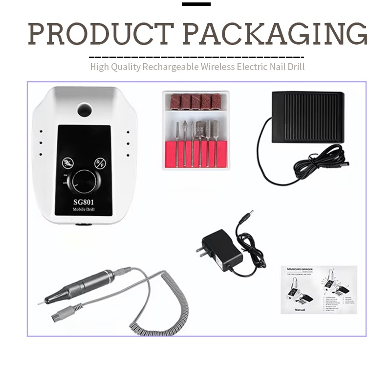 Ang nilalaman nitong 35,000 rpm electric portable gel nail drill package ay may sanding pen product, USB charging cable, product instruction manual, at magaan at portable na kahon.