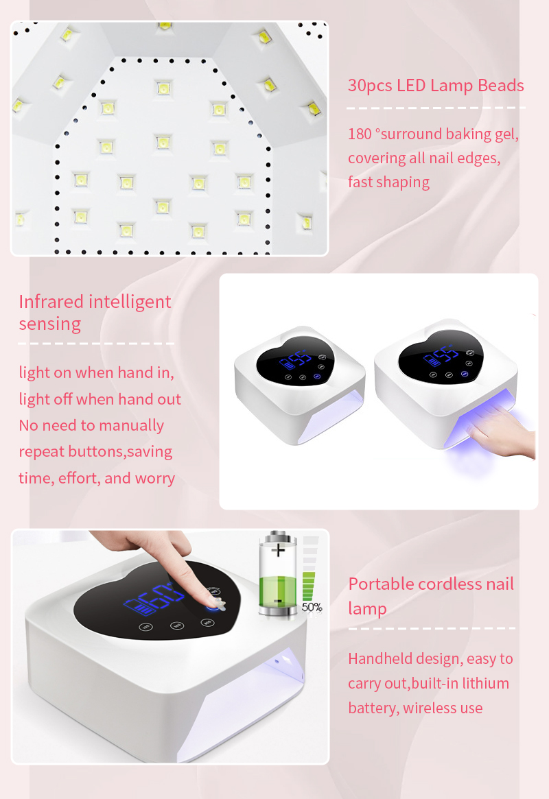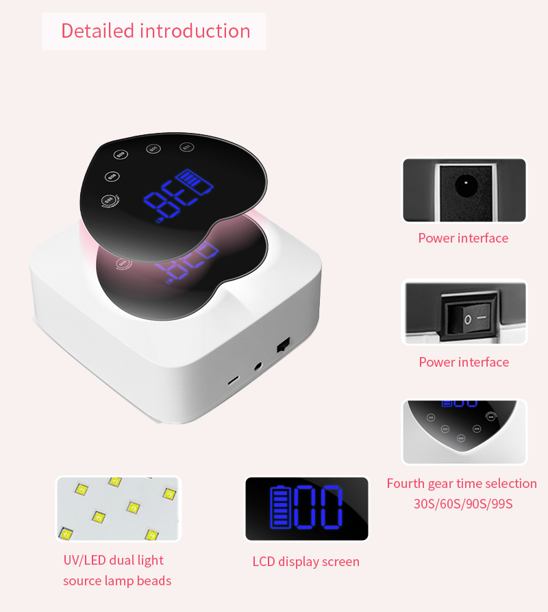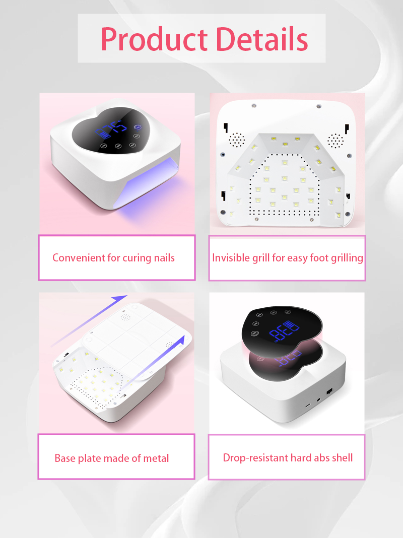 Tinitiyak ng produkto ang pantay na pagpapatuyo ng pandikit nang walang pag-urong. Ang dalawahang pinagmumulan ng liwanag nito ay nagbibigay ng banayad na pag-init upang maiwasan ang pagkawalan ng kulay ng kamay at pagkapagod ng mata, na angkop para sa parehong mga kamay at paa, na naghahatid ng napakabilis na mga resulta ng pagpapatuyo.