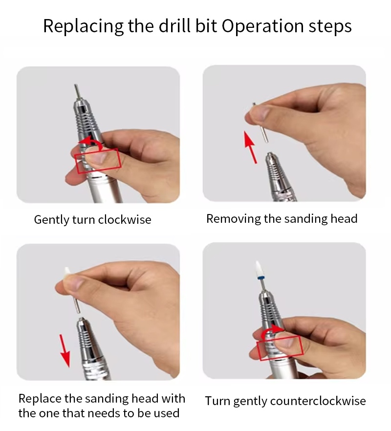 Ito handheld nail drill at polisher replacement drill operation method, iyon ay, plug at pull out, madali at maginhawa, maaaring gamitin ang pagpapalit pagkatapos makumpleto.