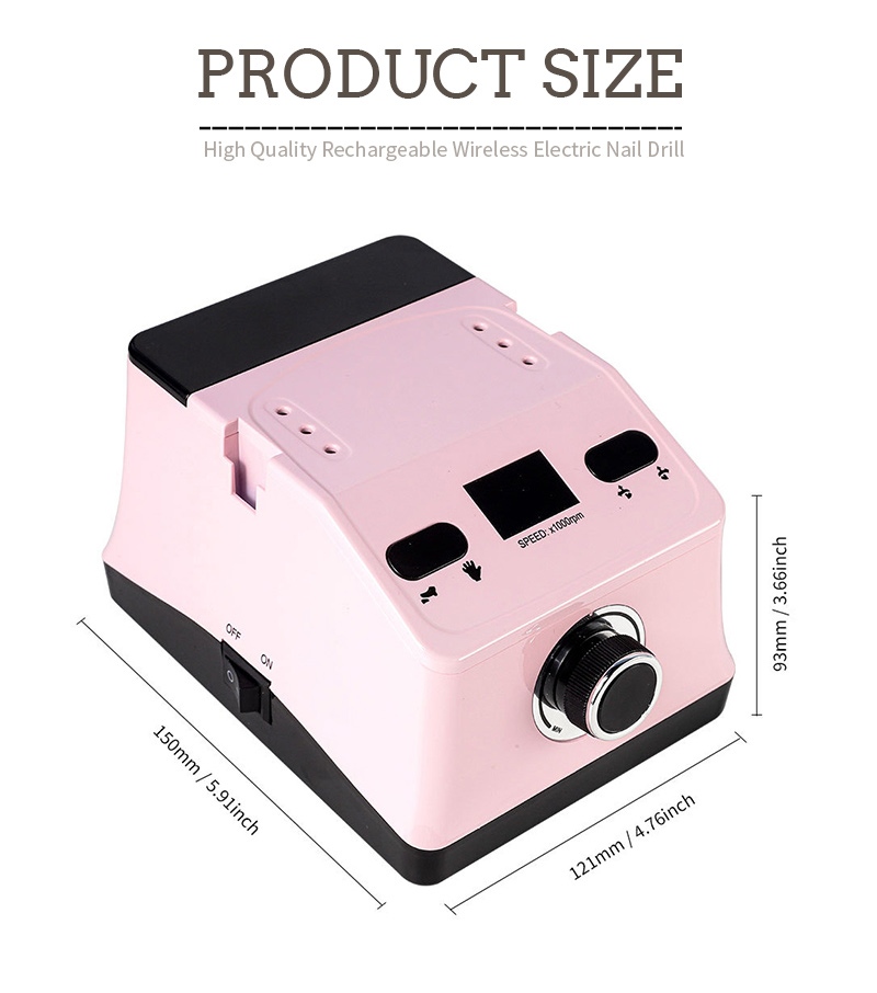 Ang disenyo ng display ng handheld nail drill at polisher na ito ay may on/off switch at forward/reverse rotation para sa kabuuang one-button activation, quick-charging socket sa ibaba, mapapalitang drill socket sa itaas, at three-position adjustable speed para matugunan ang iba't ibang pangangailangan.
