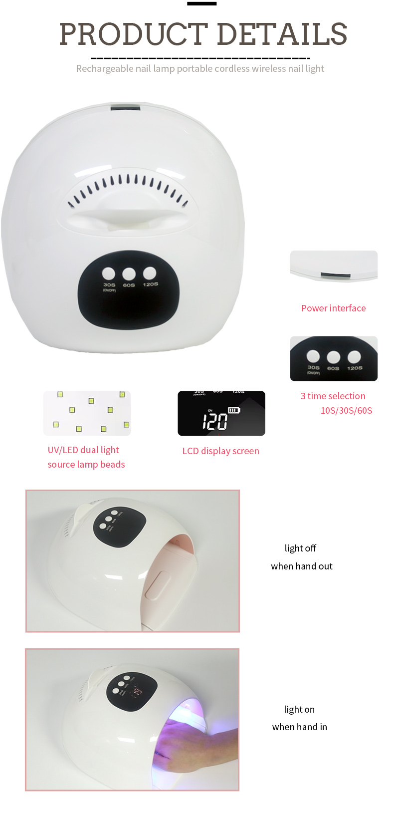 Tinitiyak ng produkto ang pantay na pagpapatuyo ng pandikit nang walang pag-urong. Ang dalawahang pinagmumulan ng liwanag nito ay nagbibigay ng banayad na pag-init upang maiwasan ang pagkawalan ng kulay ng kamay at pagkapagod ng mata, na angkop para sa parehong mga kamay at paa, na naghahatid ng napakabilis na mga resulta ng pagpapatuyo.