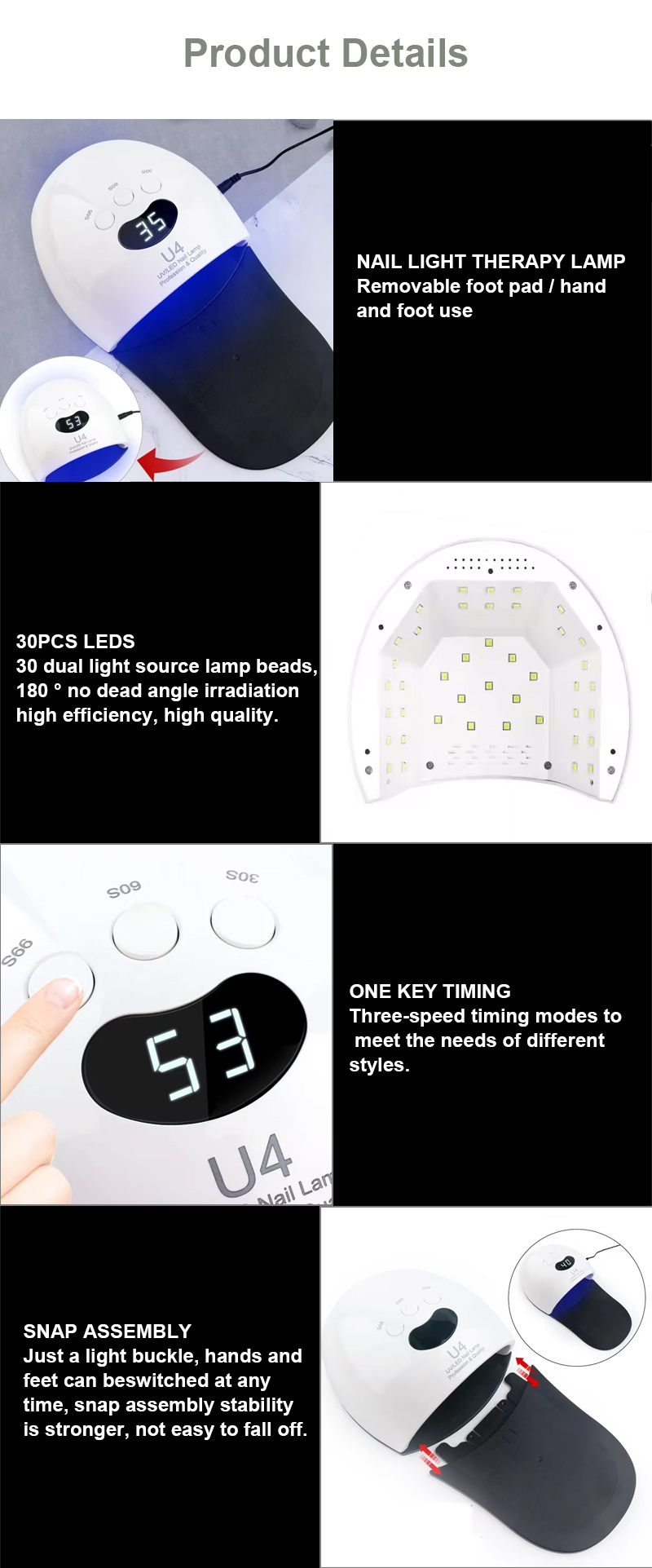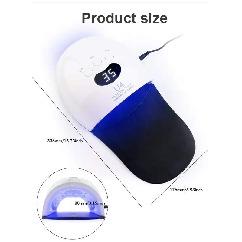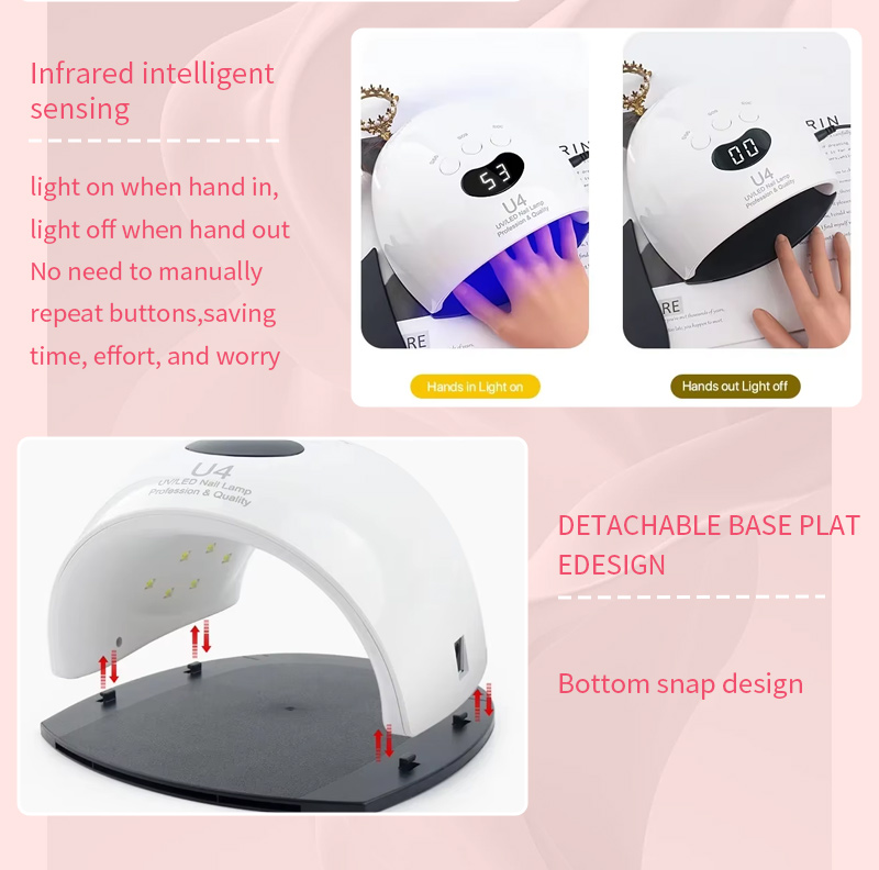 Tinitiyak ng mataas na kalidad na LED nail drying lamp na ito ang pagpapatuyo ng kola nang walang pag-urong. Ang dalawahang pinagmumulan ng liwanag nito ay nagbibigay ng banayad na pag-init upang maiwasan ang pagkawalan ng kulay ng kamay at pagkapagod ng mata, na angkop para sa parehong mga kamay at paa, na naghahatid ng napakabilis na mga resulta ng pagpapatuyo.
