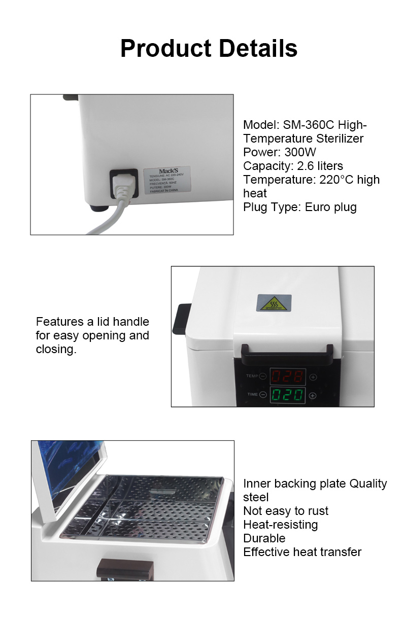 Ang isterilizer na ito ay pangunahing bumubuo ng init sa pamamagitan ng isang singsing sa pag -init, na gumagamit ng mataas na temperatura para sa pagdidisimpekta.