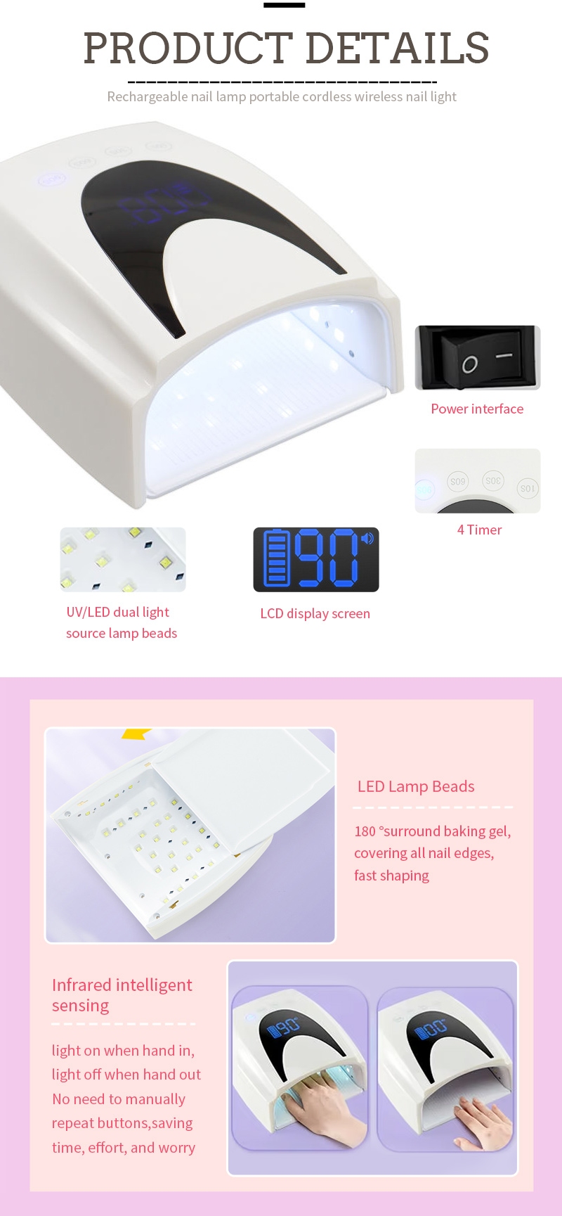 Ang produkto ay may uniporme ng pagluluto ng pandikit nang walang pag-urong ng pandikit, dobleng ilaw na mapagkukunan ng banayad na baking glue anti-black hand, ay hindi nasasaktan ang mga mata, kamay at paa ay maaaring magamit, ang mabilis na pagpapatayo ng epekto ay mataas.