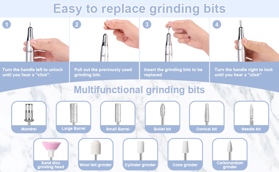 Ang mababang-ingay na portable nail drill kit na kapalit na pamamaraan ng pagpapatakbo ng drill, iyon ay, plug at pull out, madali at maginhawa, maaaring gamitin ang pagpapalit pagkatapos makumpleto.