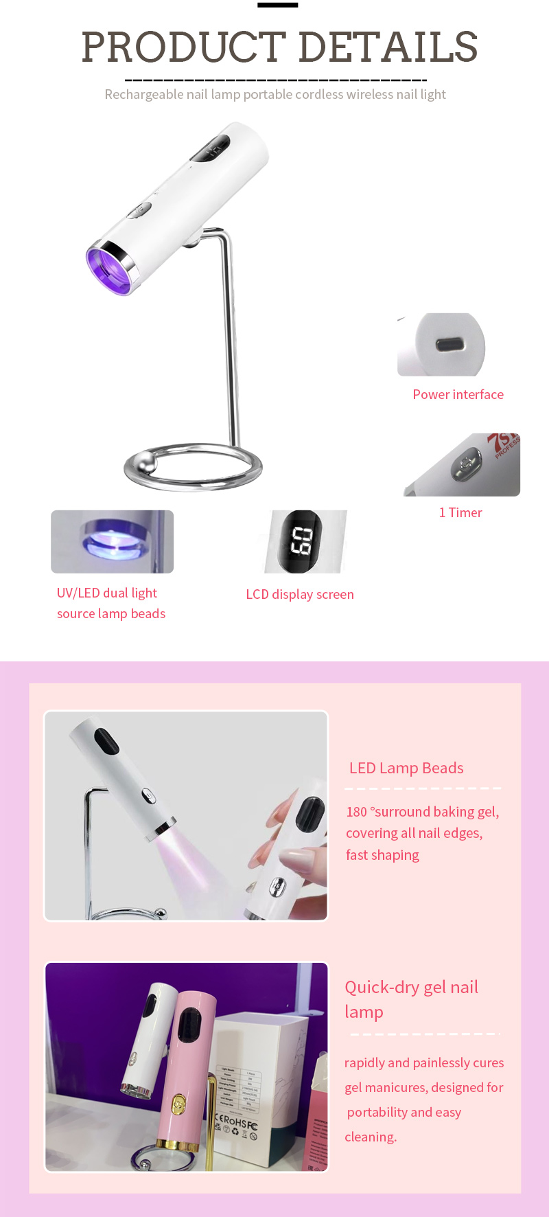Tinitiyak ng produkto kahit na ang pagpapatayo ng pandikit nang walang pag -urong. Ang dalawahang ilaw na mapagkukunan nito ay nagbibigay ng banayad na pag -init upang maiwasan ang pagkawalan ng kulay ng kamay at pilay ng mata, na angkop para sa parehong mga kamay at paa, na naghahatid ng napakabilis na mga resulta ng pagpapatayo.
