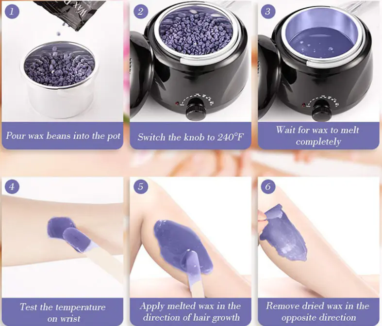 Pamamaraan ng Operasyon ng Depilatory Wax ng Produkto, mas mataas ang temperatura Ang mas mabilis na natutunaw ng waks, mas mababa ang temperatura ng mas mabagal ang pagtunaw ng waks, unang ibuhos sa naaangkop na dami ng mga depilatory wax beans, pagpainit hanggang sa matunaw ang waks ng waks, pagkatapos ay ang mga depilatory na bahagi ng pantay na pinahiran na depilatory wax, at sa wakas laban sa direksyon ng paglaki ng buhok ay lumuha.