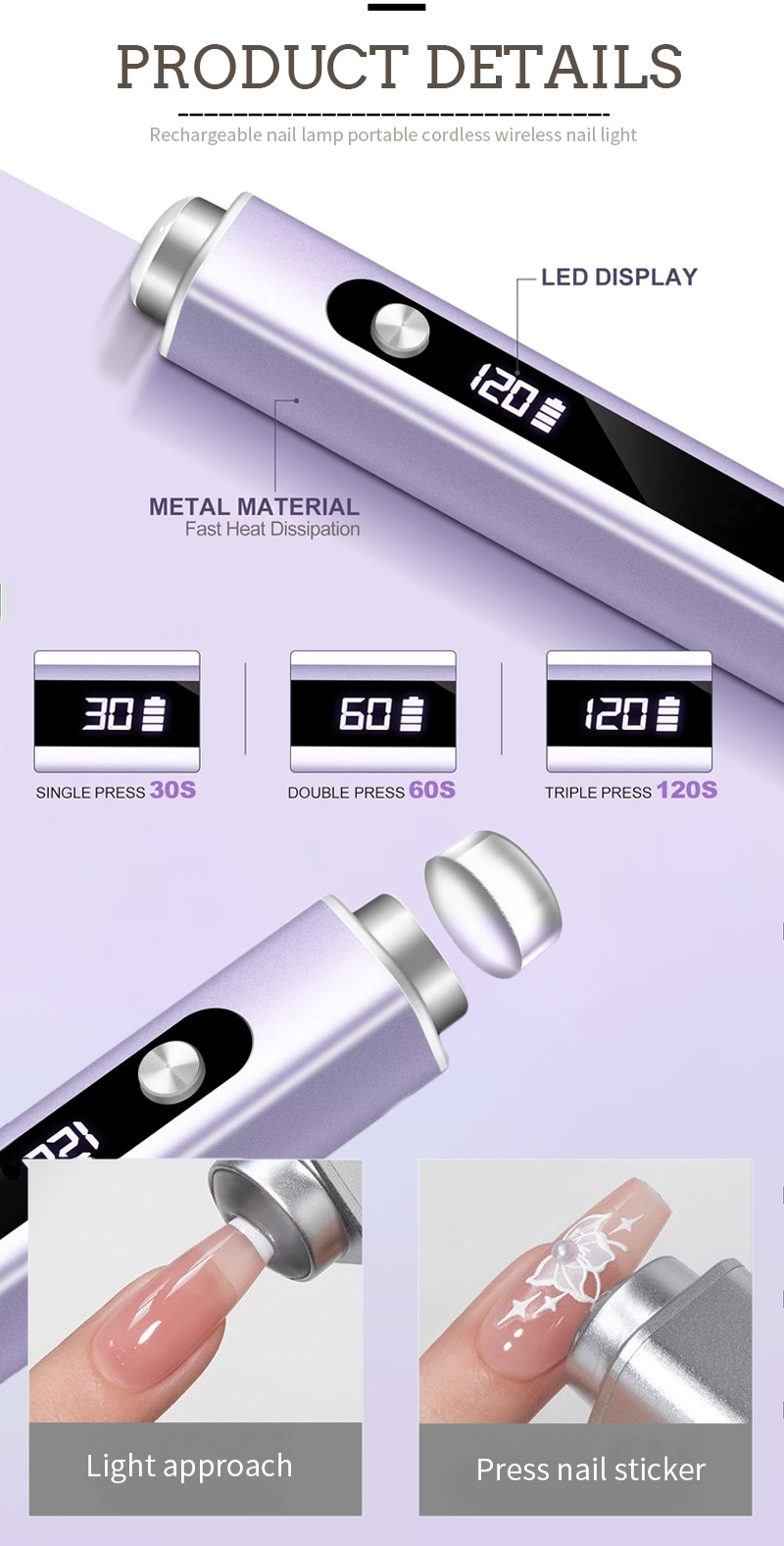 Ang disenyo ng display ng produkto, mayroong isang intelihenteng LCD screen ay maaaring magpakita ng oras ng countdown baking glue, awtomatikong nag -iilaw ang oras ng screen kapag ginagamit, at awtomatikong magsasara kapag hindi ginagamit.