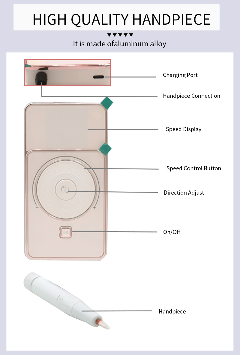Ang high-speed low-noise grinding pen display na disenyo na ito, na may sanding pen socket, LCD liquid crystal display ay maaaring magpakita ng bilang ng mga revolutions/power/direction, speed switch knob, clockwise/counterclockwise toggle button, pause button, 30,000 rpm professional motor, screw-in locking grinding head.