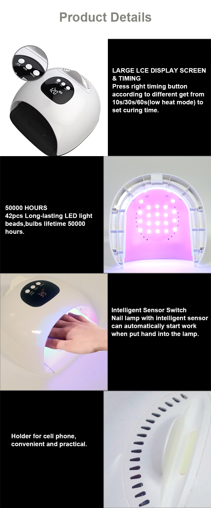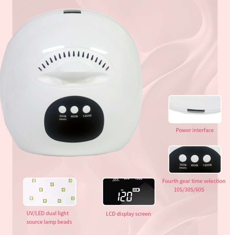 Tinitiyak ng produkto kahit na ang pagpapatayo ng pandikit nang walang pag -urong. Ang dalawahang ilaw na mapagkukunan nito ay nagbibigay ng banayad na pag -init upang maiwasan ang pagkawalan ng kulay ng kamay at pilay ng mata, na angkop para sa parehong mga kamay at paa, na naghahatid ng napakabilis na mga resulta ng pagpapatayo.