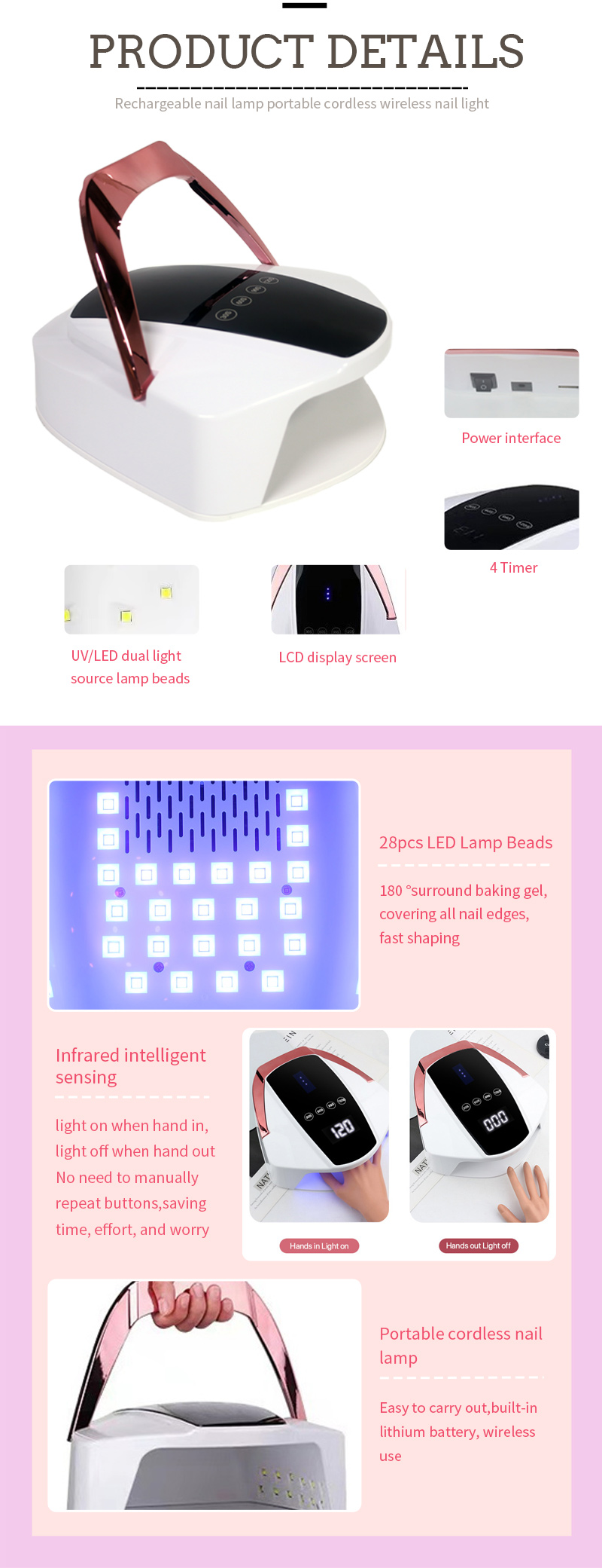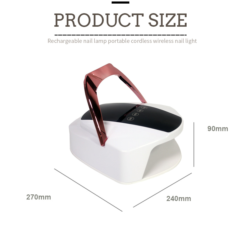 Ang Rechargeable Nail Polish Lamp Professional Version 90W na hitsura ng produkto ay may disenyo ng uka, ang hawakan sa uka ay maaaring magamit bilang isang portable na papel na hawakan, na ginagawang mas maginhawa upang dalhin at ilagay. Iniiwasan din nito ang kawalan ng hawakan na madaling masira at maluwag.