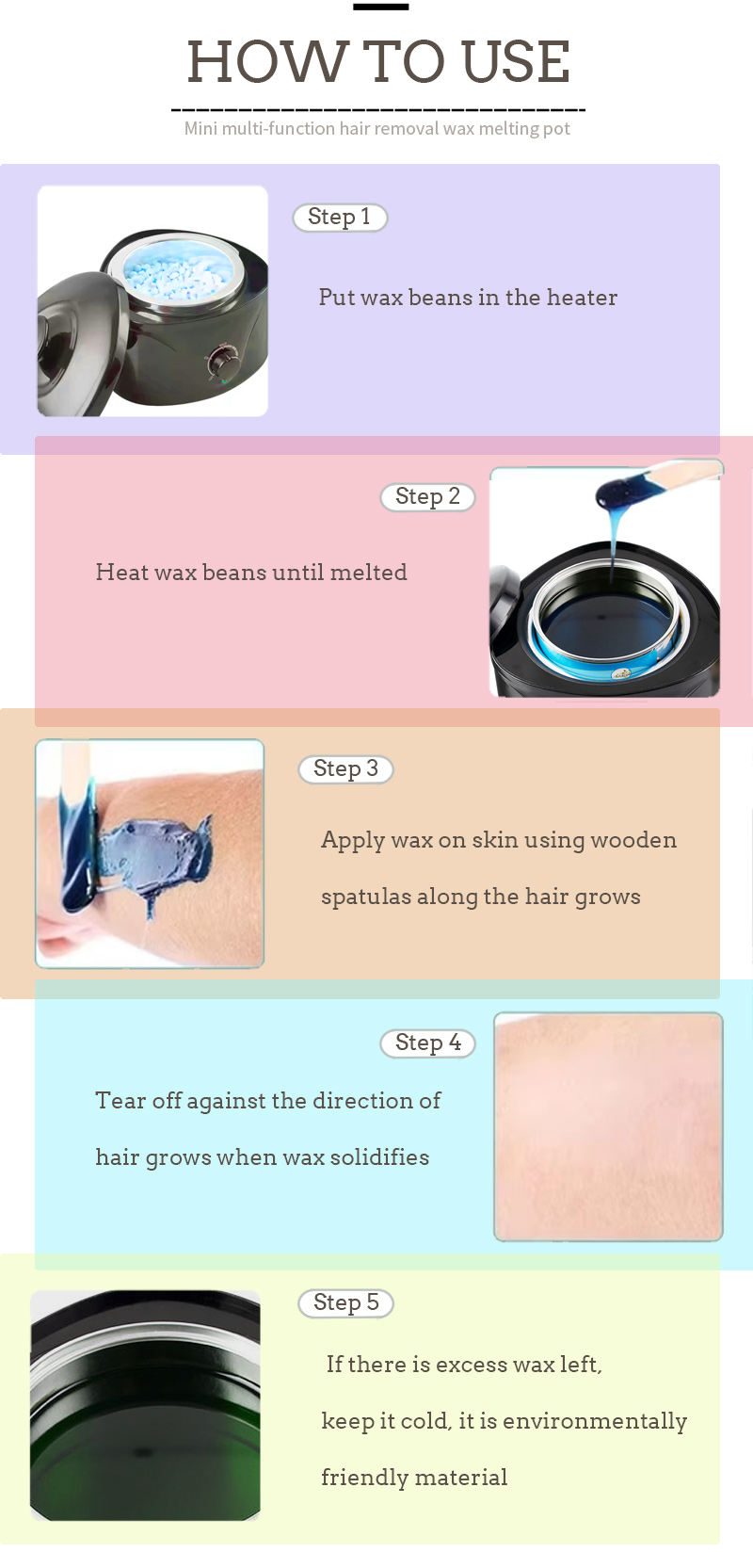 Pamamaraan ng Operasyon ng Depilatory Wax ng Produkto, mas mataas ang temperatura Ang mas mabilis na natutunaw ng waks, mas mababa ang temperatura ng mas mabagal ang pagtunaw ng waks, unang ibuhos sa naaangkop na dami ng mga depilatory wax beans, pagpainit hanggang sa matunaw ang waks ng waks, pagkatapos ay ang mga depilatory na bahagi ng pantay na pinahiran na depilatory wax, at sa wakas laban sa direksyon ng paglaki ng buhok ay lumuha.