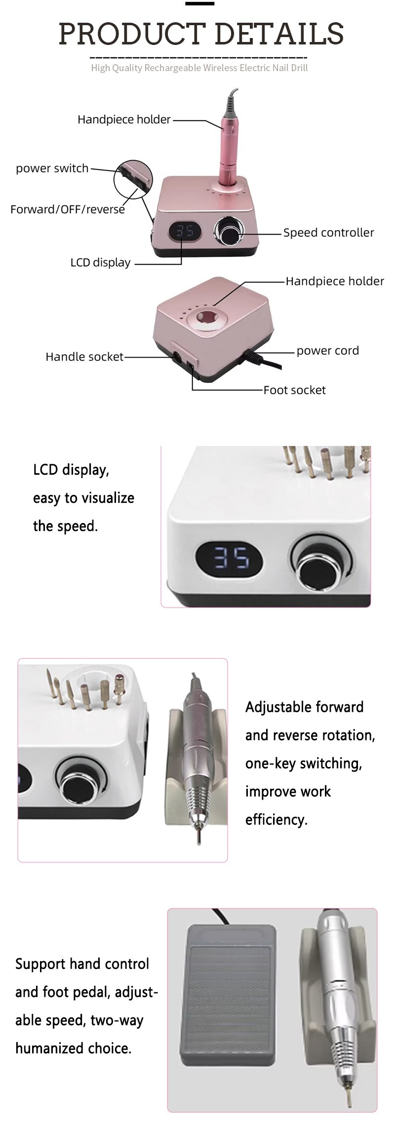 | Wireless Electric Nail Drill na may 35,000 RPM na Detalye |